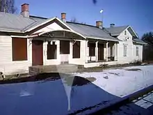 The station building in Hikiä was built according to stock plans for class IV stations on the Riihimäki–St. Petersburg line, designed by Knut Nylander. [lower-alpha 1] Construction was completed in 1869, and the building was later expanded in two phases in 1883 and 1904, using the same plans drawn by Bruno Granholm for the extensions of the Lappila station in 1876 and 1900. As per a railyard diagram dating to 1873, the Hikiä station at the time also included a warehouse and a water tower at the end of a siding stretching from the far eastern end from the railyard, as well as two additional sidings to its south.[5]