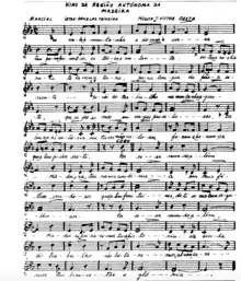 The Hino da Região Autónoma da Madeira (English: Anthem of the Autonomous Region of Madeira) is the official anthem of Madeira, an autonomous North Atlantic archipelago of Portugal. It was adopted in 1980, through Regional Decree 12/80/M of September 16.[1][2] The lyrics are by Ornelas Teixeira and the music by João Víctor Costa.