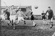 However, on 27 July 1945, the Football League's management committee refused to allow any non-league clubs into the Third Division, despite Third League clubs "wanting Bath City to join".[55] Thus, after the War, with the resumption of competitive football, they were forced to resume playing in the Southern League, and the plans to make Twerton Park one of the largest stadiums in the West Country were abandoned.[56] Ted Davis, then left the club in 1947. In total, Davis spent 17 years as first team coach. He went on to become the most successful and longest-serving manager in the club's history, winning seven trophies. Following his departure, the 1950s saw a large array of different coaches manage the club. Vic Woodley was the first to succeed Davis, appointed on 6 June 1947.[57] Though he left in 1950 after four mid-lower placed finishes,[58] and was replaced by Eddie Hapgood.[59] Attendances on average during the 1940s and 1950s were some of the highest recorded in the club's history. Notable large home attendances during this period included; 17,000 in 1944 vs Aston Villa[60] 14,000 vs Southend United in the 1952–53 season and 11,700 at Twerton Park against rivals Yeovil Town in 1957.[61] In 1956, Hapgood left the club after winning two Somerset Cups in 1952 and 1953. He was replaced by Paddy Sloan, who only remained for the 1956–57 season.[62]