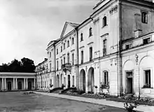 In 1692 Stefan Mikołaj Branicki, the son of Jan Klemens Branicki, obtained the rights to the city of Białystok from King John III Sobieski and built Branicki Palace in the city on the foundations of former defensive castle of Wiesiołowskis' family.[32] The project's author is a prominent architect: Tylman of Gameren.[32] In the second half of the 18th century the ownership of the city was inherited by Field Crown Hetman Jan Klemens Branicki. It was he who transformed the previously existing palace built by his father into the magnificent residence of a great noble,[33][9] which was frequently visited by Polish kings and poets.[34] Numerous artists and scientists came to Białystok to take advantage of Branicki's patronage. In 1745 Branicki established Poland's first military technical college, School of Civil and Military Engineering[35] and in 1748, one of the oldest theaters in Poland, the Komedialnia.[36] New schools were established, including a ballet school in connection with the foundation of the theater.[37] On 19 November 1748 marries Izabella Poniatowska as his third wife Hetman Jan Klemens Branicki. In 1749, King Augustus III of Poland confirmed city rights, and extended the city limits.[38]