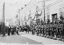 The German command wanted to keep the railway lines at all costs, so that this army could return to Germany, and there were only two roads: through Białystok and Grajewo to East Prussia or through Warsaw to Berlin. Józef Piłsudski chose to avoid the option of German Army passing through the center of the country and be withdrawn by road through Białystok. Therefore, Białystok had to be left in German hands. On 5 February 1919, another Polish-German agreement was signed, so that where the German army withdrew, Polish troops could enter, because of the Russian Revolution and they were afraid of the occupation of other cities by the Red Army.[57] Following that, a Provisional Municipal Committee was created, headed by Józef Puchalski, an experienced local government official and patriot. Representatives representing the Polish, Jewish, German and Russian communities sat on the committee. On 8 February 1919, the Committee met again. A German commander of Bialystok, Roszer, sat next to Puchalski, and gave a farewell speech. Over the next days, the Germans liquidated their administration.[58]