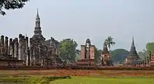 In the Sukhothai Kingdom (13th-15th century), Theravāda, Mahāyāna, as well as Khmer Brahmanism were all practiced at first.[67][68] King Ram Khamhaeng (fl. late 13th century) was the first Thai king to give his full royal support to the Sinhalese Theravāda school.[69][70] He patronized Buddhism in the traditional way, by providing material support for the sangha and building temples such as Wat Chang Lom.[71]
