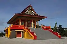 Like in other Southeast Asian countries, medieval Buddhism in Laos included Mahāyāna Buddhism, Tantric Buddhism and Theravāda Buddhism.[76] The political influence of Southeast Asian Theravāda helped make it the main religion of the Laotian kingdom of Lan Xang (1353–1707), which had close ties to the Thai and Khmer realms.[77] Like in other regions, Laotian Theravāda also retained numerous "animistic" elements like the veneration of local spirits (lak muang) and magical objects (sing saksit). These practices were often part of Buddhist temples.[78] Lao kings like Vixun (r. 1500 - 1520) adopted the Dharma king model of Theravāda Buddhism, promoted the establishment of temples (such as Vat Simuang and Pha That Luang) and palladiums (sacred protectors) such as Phra Bang.[79]