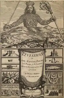 Frontispiece from the first edition of Leviathan (1651) which serves as a visual representation of Hobbes's idea of the state. The city pictured in the foreground of the image represents civilisation, while the salient figure (Leviathan), with a sword and crosier in hand, personifies sovereignty and the omnipotent state, possessing the authority to represent the collective will of the people.[6]