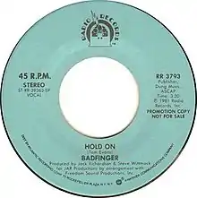 "Hold On" is the third track from Badfinger's 1981 album Say No More. Co-written by Tom Evans and Joe Tansin (who had actually left the band prior to the recording of Say No More and was not credited on the original release), the track was their second to last new single (the last being "I Got You", also from Say No More).