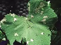 The larvae feed on Vitis vinifera. They mine the leaves of their host plant. The mine starts as a relatively long, slender gallery. Later, the mine becomes a small blotch with small cut-outs. Pupation takes place in a cocoon which is often attached to the stems or leaves of the host plant.[2]