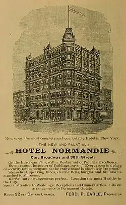 The Hotel Normandie was a luxury hotel located on Broadway at 38th Street in New York City. The 8-story building[1] was put up by Ferdinand Earl, an heir of the Fisher family, opening in 1884.[2][3][1] Amenities were advertised to include "Steam heat, speaking tubes, electric bells, burglar and fire alarms attached to all rooms".[4] Rooms rates started at $2/day.[4] Dinner was available for $1.25 additional; a quart bottle of Moët & Chandon champagne was $4.[5]