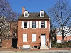 House at 9 North Front Street is a historic home located in the Jonestown Historic District in Baltimore, Maryland, United States. It is a 2+12-story brick townhouse with a 2-story rear wing. It is three bays wide and two rooms deep. The main house features a gable roof with two dormers on each side and two interior chimneys connected by a parapet. The house is located at 9 North Front Street and was built by either John Beale Bordley or Charles Torrence circa 1790. The house was the residence of Thorowgood Smith, second Mayor of Baltimore (1804-1808). It rests on an area of downtown Baltimore traditionally known as “Old Town”. Even earlier on, it was known as “Jones Town”. This area was annexed to Baltimore in 1745 and its settlement predates that of Baltimore Town. More specifically, the house is located in a neighborhood known today as Shot Tower Park. Once part of a whole row of Conservative Conservative Georgian style brick masonry 2+12-story townhomes, this house is the last extant example on the street, and one of just a few 18th century townhouses remaining in all of Baltimore.[2]