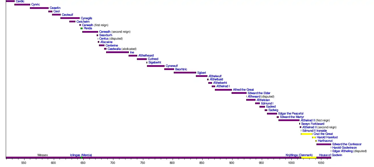 The House of Wessex, also known as the House of Cerdic, the House of the West Saxons, the House of the Gewisse, the Cerdicings and the West Saxon dynasty, refers to the family, traditionally founded by Cerdic of the Gewisse, that ruled Wessex in Southern England from the early 6th century. The house became dominant in southern England after the accession of King Ecgberht in 802. Alfred the Great saved England from Viking conquest in the late ninth century and his grandson Æthelstan became first king of England in 927. The disastrous reign of Æthelred the Unready ended in Danish conquest in 1014. Æthelred and his son Edmund Ironside attempted to resist the Vikings in 1016, but after their deaths the Danish Cnut the Great and his sons ruled until 1042. The House of Wessex then briefly regained power under Æthelred's son Edward the Confessor, but lost it after the Confessor's reign, with the Norman Conquest in 1066. All kings of England since Henry II have been descended from the House of Wessex through Henry I's wife Matilda of Scotland, who was a great-granddaughter of Edmund Ironside.