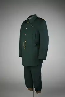 Hovjägmästare in Sweden has a uniform (equivalent to court uniform) consisting of a single row waffenrock of dark green cloth with gold galloon on the collar and cuffs, gilded buttons with the royal crown and the colonel's epaulettes (older model) with the head of state monogram; dark green trousers with gold galloon; gold belt with fringes; hirschfänger or sabre; white gloves and black bicorne with cockade and a green hanging plume.[4] Överhovjägmästare and first hovjägmästare had the same uniform with general's insignia and bouillon tassels in the belt.[4]