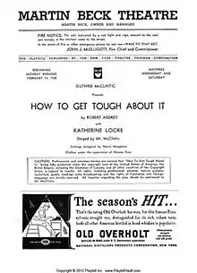 How to Get Tough About it opened on Broadway in 1938. It was presented by Guthrie McClintic, who bought the script after a single reading.[1] The production starred Katherine Locke and Myron McCormick, who were praised for their acting. Brooks Atkinson, reviewing for the New York Times, wrote "In their scenes together Miss Locke and Mr. McCormick act with fervent sincerity that is beautifully matched and one of the acting treasures of this stirring season."[1]