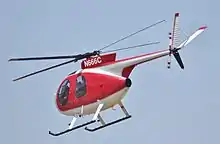 The Hughes Model 269 was the company's first successful helicopter design. Built in 1956, and entering production in 1957, it served to capture a large portion of the commercial market for Hughes.[3] It would eventually become part of the Army inventory as a primary trainer (TH-55 Osage). In May 1965, the company won the contract for a new observation helicopter for the U.S. Army, and produced the OH-6 Cayuse (Hughes Model 369).[4] The OH-6 was later developed into the civilian Model 500, variants of which remain in production to this day.
