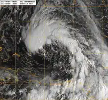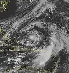 In late September, a large area of disturbed weather associated with two tropical waves formed just east of the Lesser Antilles.[2] The disturbance drifted very slowly west-northwestward,[3] inhibited by strong wind shear that eventually caused the westernmost wave to dissipate.[4] Albeit weak, an elongated remnant trough, or area of low pressure, persisted for several days, stalling over the extreme eastern Caribbean Sea as a nearby upper-level cyclonic vortex retrograded to its north.[4][5] By October 5, the trough had drifted northward into a more favorable atmospheric environment over the Virgin Islands, which allowed the lowest pressures to extend to the surface. The low became well defined, interacting with the adjacent upper vortex to produce a wide convective band—a concentrated region in which strong showers and thunderstorms can form—over the northeastern Caribbean.[6] Over the next day, the system continued to acquire a prominent subtropical structure,[7][8] developing a markedly larger wind radius than typically seen in pure tropical cyclones. Satellite observations also revealed that although the lower wind circulation was distinct, it had become intertwined with the cyclonic vortex aloft to its southwest, confirming the hybrid nature of the system.[9] The National Hurricane Center (NHC) thus classified the system as a subtropical depression at 06:00 UTC on October 6, when it was 265 mi (425 km) north-northwest of San Juan, Puerto Rico.[10]