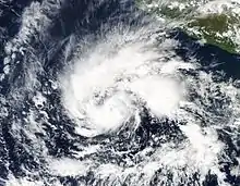 A Tehuantepec gap wind event in conjunction with horizontal wind shear spurred development of a vortex within the disturbance and a well-defined low formed by 12:00 UTC on November 23.[1] Six hours later the low acquired sufficient convective organization, including elongated banding features to the north,[4] to be classified Tropical Depression Twenty-Two-E. At this time, the depression was situated 435 mi (705 km) south-southwest of Acapulco, Mexico.[1] Aided by high sea surface temperatures of 86 °F (30 °C), ample ocean heat content and low wind shear, the small system quickly intensified into a tropical storm—at which time the NHC assigned it the name Sandra—and developed a central dense overcast.[1][5][6] A prominent banding feature with cloud tops below −112 °F (−80 °C) and frequent lightning formed north of the circulation on November 24.[7] By 18:00 UTC, a 23 to 29 mi (37 to 47 km) wide eye became apparent, signaling the onset of rapid intensification.[1]