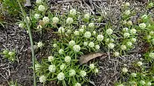 Hyalosperma demissum is a rounded, small annual to 5–20 mm (0.20–0.79 in) high and sparsely covered with long, soft, straight hairs or smooth. The leaves are linear and more or less triangular in cross-section, about 5 mm (0.20 in) long, about 0.2 mm (0.0079 in) wide and gradually tapering to a point. The whitish-yellow flowers are in dense clusters amongst the foliage, the bracts are arranged in 3-4 rows, broadly oblong to oval shaped, outer bracts 2–2.5 mm (0.079–0.098 in) long, almost translucent, light green, silvery or light yellowish brown. The florets are in groupings of 15-25 and the corolla has 3 or 4 lobes. Flowering occurs from September to December and the fruit is a dry, one-seeded, compressed, egg-shaped, warty and about 0.7 mm (0.028 in) long.[2][3]