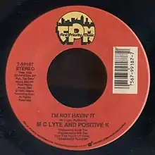"I'm Not Havin' It" is a song by American rappers Positive K and MC Lyte. It was included on the 1988 compilation album The First Priority Music Family: Basement Flavor and released as a single the following year. The B-side "A Good Combination", by Positive K as solo artist, is the main song in some versions of the single.[2][3]