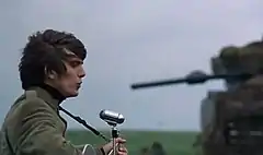 The premise and the level of security afforded the band mirrored the adulation they received in real life, at the height of Beatlemania.[42][58] Media theorist Stephanie Fremaux comments on the imagery employed by director Richard Lester in his harsh editing and shots of soldiers and weaponry to convey a sense of threat, and how this is furthered by the Beatles', and particularly Harrison's, apparent hostility and avoidance of eye contact with the camera.[58] Film historian Stephen Glynn highlights a shot that features Harrison in profile, singing into a metallic microphone, and the corresponding gun barrel of a tank as an example of Lester making "visual parallels between the tools of the musician and the military". Another example, according to Glynn, is an aerial shot of the band encircled by six tanks that cuts to a close-up of the fretboard of Harrison's guitar, with the focus soon changing to reveal Stonehenge in the near distance.[59][nb 6]