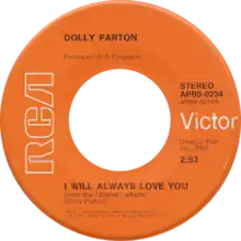 "I Will Always Love You" is a song written and originally recorded in 1973 by American singer-songwriter Dolly Parton. Written as a farewell to her business partner and mentor Porter Wagoner, expressing Parton's decision to pursue a solo career,[1] the country single was released in 1974. The song was a commercial success for Parton, twice reaching the top spot of Billboard Hot Country Songs: first in June 1974, then again in October 1982, with a re-recording for The Best Little Whorehouse in Texas soundtrack.