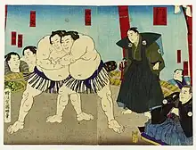 Ichinoya (left) faces Nishinoumi I (right) in a sumo match in 1887