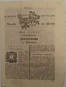 Giambattista Albrizzi remained the publisher until his death in 1777 (except from 1754 to 1758 when the newspaper was owned by the actual editor, Girolamo Zanetti). After Giambattista Albrizzi the newspaper passed to his son Angelo and since 1798 to his grand-nephew Giambattista.[3] In 1811 the Albrizzi lost the privilege to publish such newspaper due to a dispute, and the Nuovo Postiglione was later published by Antonio Caminer.[4] By order of the government of the Kingdom of Italy, in March 1812 the publications were interrupted along with all other newspapers in Venice, substituted by the Giornale dipartimentale dell'Adriatico published however always under the direction of Antonio Caminer.[4]: 85 It was resumed on 2 January 1816.