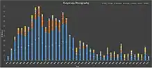 A graphical representation of Ilaiyaraaja's discography over the years with colours to represent languages