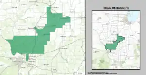 Following the 2020 census and the subsequent redistricting cycle, the 13th congressional district was significantly altered to include Champaign, Urbana, most of Decatur and Springfield, and most of the Metro East of St. Louis.[3] All of Macoupin County, and sections of Champaign, Macon, Madison, Piatt, Sangamon, and St. Clair Counties, are included in the new 13th.[4] The redistricting turned the 13th district from a fairly even district to a more heavily Democratic-leaning one, and consequently it voted for a Democratic representative for the first time since 1892.