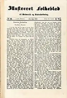 The newspaper was published weekly, and it bore the subtitle til Belærelse og Underholdning 'for education and entertainment'. Bjørnstjerne Bjørnson was the founder and editor of the paper,[1][2] and he had several of his first peasant stories printed in it. Among these, Synnøve Solbakken, which was printed in Illustreret Folkeblad in 1857, is particularly noteworthy.[3]