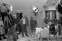 Director Siegfried Breuer (left, seated) with actors Rudolf Melichar and Carl Wery (right, sitting at table) during filming.