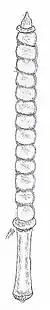 The Indan is straight and has a twisted, elongated striking head. The handle is smooth and rounded at the pommel. A metal plate, which is worked out in the shape of a flower, serves as the end. The front end is finished with a kind of crown. The shape of the Indan goes back to a mythological weapon used by gods and heroes in Indonesian myths. The Indan is used by ethnic groups from Java.[1]