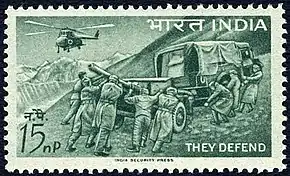 Commemorative stamps have been released were released by India Post depicting field artillery, a gunner and howitzer from Mountain Battery on the Golden Jubilee of the Regiment of Artillery and on the 50th anniversary of the 9 (Parachute) Field Regiment.[21][22][23]