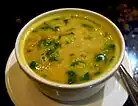 Ayurvedic texts classifies food into three categories, namely; Sattvic, Rajasic and Tamasic foods. Tastes (rasa) is classified into six types known as Shadrasa according to their qualities for ideal meal. These six tastes include; sweet, salty, sour, pungent, bitter, astringent. Traditional meal presentation often includes all six of these flavors.[8][9] Several Samhitas from Ayurveda texts describes and discusses methods to cook food, it mentions recipes for cooking rice in different ways, Tāpaharī (seasoned-rice dish), Khichadi (rice-lentil dish), Takra (curd dish), Yusha (lentil dish), Vesavara (minced meat dish), different methods to cook grains, pulses, meats, milk products, vegetables, fruits, leafy greens, roots, oils, sugarcane products to prepare foods.[10] It describes varieties of meat recipes such as; the Ullupta (minced meat dish), Bharjita (fried), Pishta (made into balls or pattie), Pratapta (roasted with clarified butter over a charcoal fire), Kandupachita (dipped in mustard oil and powdered aromatic condiments and roasted and done to a honey colour over a charcoal fire), Parishushka and Pradigdha go by the general name of Shulya (meat cooked over charcoal fire), among others.[11]