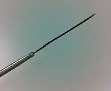 An inoculation needle is a laboratory equipment used in the field of microbiology to transfer and inoculate living microorganisms.[1] It is one of the most commonly implicated biological laboratory tools and can be disposable or re-usable.[1] A standard reusable inoculation needle is made from nichrome or platinum wire affixed to a metallic handle.[2][3] A disposable inoculation needle is often made from plastic resin. The base of the needle is dulled, resulting in a blunted end.[2][3]