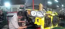 A student from automotive faculty working on a car used by ILPKL to compete in drag racing.