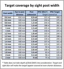 Low-power scope sights with a variable magnification starting at 1x (called low-power variable optics, or LPVOs) are popular, with magnifications of 1–6x or 1–8x and daytime bright illuminated reticles are the most popular. Usually, only the center of the reticle is illuminated. Some reticles have milliradian-based wind holds or holdover marks to compensate for wind and bullet drop on long-range targets, while others prefer reticles with a simple dot and crosshair and choose to dial long-range adjustments on the turrets instead.[21] Turrets are often exposed and lockable, having ballistic drop compensation (BDC) and a zero stop, while some competitors choose to use capped turrets for the wind adjustment. Important optical characteristics[22] are true 1x or 1.1x low-end magnification, while on higher magnification it is important with a large field of view and a large exit pupil. Some other important scope qualities are weight and stray light performance.