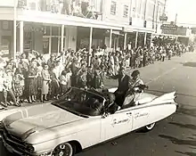 John F. Kennedy and Jacqueline visiting in 1959, while seated in a Cadillac Eldorado Biarritz convertible