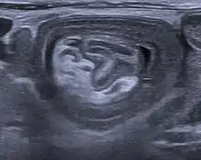 An intussusception is often suspected based on history and physical exam, including observation of Dance's sign. A digital rectal examination is particularly helpful in children, as part of the intussusceptum may be felt by the finger. A definite diagnosis often requires confirmation by diagnostic imaging modalities. Ultrasound is the imaging modality of choice for diagnosis and exclusion of intussusception, due to its high accuracy and lack of radiation. The appearance of target sign (also called "doughnut sign" on a sonograph, usually around 3 cm in diameter, confirms the diagnosis. The image seen on transverse sonography or computed tomography is that of a doughnut shape, created by the hyperechoic central core of bowel and mesentery surrounded by the hypoechoic outer edematous bowel.[11] In longitudinal imaging, intussusception resembles a sandwich.[11] It is also called "pseudokidney" sign because hyperechoic tubular centre is covered by a hypoechoic rim producing a kidney-like appearance.[12]