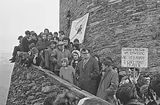 Communities and institutions were divided on the issue of the investiture. These included the Urdd, Plaid Cymru, the Gorsedd and non-conformist denominations. Students in all of the University of Wales campuses held multiple sit-in protests and hunger strikes to show their opposition to the investiture. The FWA and Mudiad Amddiffyn Cymru also added to the tension. Because of the tension and protests leading up to the investiture of July 1969, the UK government drafted many soldiers and detectives, as well as agents provocateurs, to ensure a smoothly running ceremony in Caernarfon.[24] Campaigning was led by Mudiad Amddiffyn Cymru (MAC, Movement for the Defence of Wales) and the Free Wales Army, with the situation described before the investiture as "something close to open warfare between the Government's police and young people of Wales".[25]