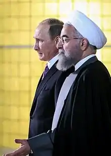 Until 1720, on the surface, relations between Iran and Russia were largely friendly and the two operated on a level of equity.[2] After 1720, with Peter the Great's attack on Iran and the establishment of the Russian Empire, the first of a long series of campaigns was initiated against Iran and the Caucasus.[2] The Russian Empire had an oppressive role in Iran during the 19th and early 20th centuries which harmed Iran's development, and during most of the ensuing Soviet period, the shadow of the "big northern neighbour" continued to impend.[3] Since the fall of the Soviet Union, the two neighboring nations have generally enjoyed very close cordial relations. Iran and Russia are strategic allies[4][5][6] and form an axis in the Caucasus alongside Armenia. Iran and Russia are also military allies in the conflicts in Syria and Iraq and partners in Afghanistan and post-Soviet Central Asia. The Russian Federation is also the chief supplier of arms and weaponry to Iran. Due to Western economic sanctions on Iran, Russia has become a key trading partner, especially in regard to the former's excess oil reserves. Currently Russia and Iran share a close economic and military alliance, and both countries are subject to heavy sanctions by most Western nations.[7][8]