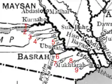 Julan's withdrawal to Basra and the weakness of the government forces allowed the Zanj to continue their raiding activities in lower Iraq unimpeded.[15] Soon after Ju'lan left the field, 'Ali ibn Muhammad decided to undertake an expedition against one of the cities of the region. He initially intended to send his troops against 'Abbadan; after his army began their march, however, he was advised that al-Ubulla would be a better target. As a result, he recalled his men and ordered them to head toward that city instead.[16]