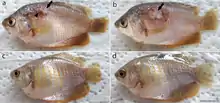 Dwarf gouramis infected with another disease displaying ulcers, a common symptom of DGD