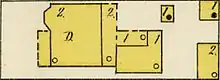 The footprint of the 1890 Isaac Heffron House as seen in the 1899 Sanborn fire insurance map of Galveston.