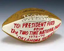 ![]() A football from the Oklahoma Sooners and signed by the team. Notable signatures include Billy Sims (1978 Heisman Trophy winner) and J. C. Watts. On the white quarter of the football an inscription to Ford was written in red. | |