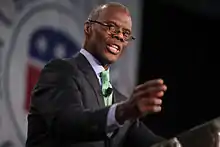 Following the election, Watts switched from the Financial Services Committee to the House Transportation Committee.[6] He was the only African-American Republican in the House and was chosen to deliver the Republican reply to President Bill Clinton's State of the Union address in February 1997,[4] the youngest congressman and first African-American to do so.[5] In his response, Watts focused on providing a positive vision of the Republican Party and advocated deficit and tax reduction and faith-based values.[4] Watts had previously spoken to The Washington Times and created controversy by criticizing "race-hustling poverty pimps"[4] as keeping African-Americans dependent on government. These remarks were viewed as critical of activist Jesse Jackson and Washington, D.C. mayor Marion Barry, and Jesse Jackson Jr. demanded a public apology.[4] Watts stated he did not speak about Barry and Jackson but about "some of the leadership in the black community."[4]