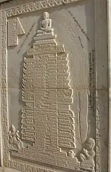 Traditional Jains, like Buddhists and Hindus, believe in the efficacy of mantras and that certain sounds and words are inherently auspicious, powerful and spiritual.[158][159] The most famous of the mantras, broadly accepted in various sects of Jainism, is the "five homage" (panca namaskara) mantra which is believed to be eternal and existent since the first tirthankara's time.[158][160] Medieval worship practices included making tantric diagrams of the Rishi-mandala including the tirthankaras.[161] The Jain tantric traditions use mantra and rituals that are believed to accrue merit for rebirth realms.[162]