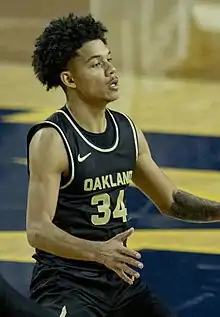 For his junior season, Moore moved to the NCAA Division I, transferring to Oakland.[5] He was drawn there in part due the success Kay Felder, another undersized point guard, had with the program.[6] On January 8, 2021, Moore scored 33 points in an 84–81 loss to Green Bay in overtime.[7] On January 16, he posted 31 points and 12 assists in an 81–74 win over Youngstown State.[8] Six days later, Moore recorded 18 points, 14 assists and 11 rebounds in an 86–81 victory over Detroit Mercy, the first triple-double by an Oakland player since Felder in 2016.[9] He averaged 17.9 points, a Division I-leading 8.4 assists and 4.1 rebounds per game.[10] Moore was named to the First Team All-Horizon League.[11] He was named to the Second Team All-Horizon League as a senior.[12]