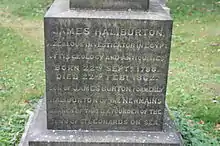 James was the fourth child and second son of property developer James Burton (formerly James Haliburton) and Elizabeth Westley (12 December 1761 – 14 January 1837), of Loughton, Essex, daughter of John and Mary Westley. The son was christened 'James Haliburton' but his father changed the family surname to Burton in 1794.[1] The son James then changed his surname to Burton also, although he was the only member of the family to subsequently change his surname back to Haliburton (in 1838).[2][3][4] He was an older brother of the architect Decimus Burton, the physician Henry Burton, and the gunpowder manufacturer William Ford Burton.[3][5][6]