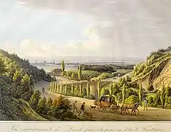 From about 1794, Lord Findlater visited Bohemian Carlsbad (Karlovy Vary), to benefit from drinking the spa waters. He became a significant patron of the city and gave large sums of money to local charities and for laying out and improving the environs of the town including paths.[6] Findlaterova stezka (Findlater path) continues to be a well used trail.[7] Within the trails is Findlater's Temple, a classical semi-circular building surrounded by a cupola, erected by Lord Findlater, in gratitude for the benefits be received from the Carlsbad waters. Also nearby is Findlater's Obelisk made of granite, twenty-eight feet in height, erected in 1804 in honour of Lord Findlater, " the friend and beautifier of nature, as a token of the gratitude of the citizens of Carlsbad." The obelisk commands a fine view of the valley below.[8]