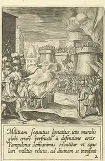 Barbé had a close relationship with Rubens whose works he had already started to engrave when both artists were residing in Italy. Upon his return to Antwerp, he continued to engrave many works after Rubens. He is generally presumed to be the engraver (although some sources mention Cornelis Galle the Elder as the engraver) of the prints in the Vita beati P. Ignatii Loiolae, Societatis Iesu fundatoris published in 1609 in Rome on the occasion of the beatification of the Ignatius Loyola, the founder of the Jesuit Order.The work contain 87 copperplate engravings (plus the title page and frontispiece) recounting major events and teachings in the life of Loyola. The designs for the work have traditionally been attributed to Rubens who had a special relationship with the Jesuit Order throughout his career.[11] It is now believed that some of the prints directly go back on designs by Rubens, others had some involvement of Rubens and others not.[12] After the canonisation of Loyola in 1622 a second edition was produced to which was added a print, which had been prepared for the first edition but was not used, representing the canonisation. This work represents the largest illustrated life of the saint.[13]