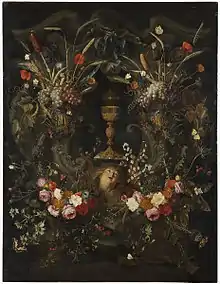 A number of his still lifes fall into the category of 'garland paintings'. Garland paintings are a type of still life invented in early 17th century Antwerp by Jan Brueghel the Elder and subsequently practised by leading Flemish still life painters, and in particular Daniel Seghers. Paintings in this genre typically show a flower or, less frequently, fruit garland around a devotional image or portrait. Garland paintings were usually collaborations between a still life and a figure painter. The figure painter would take care of the figures inside the cartouche while the still life painter was responsible for the flower or fruit garland.[9] The names of the collaborators of Gillemans on his garland paintings are not generally known but a collaboration with Thomas Willeboirts Bosschaert is presumed.[10] An example of Gillemans' work in this genre is the Garland of Flowers Surrounding a Cartouche Containing an Angel's Head and the Holy Sacrament (Victoria and Albert Museum). The garland includes thistles, grains, grapes and other flowers and fruit that allude to the Passion of Christ and to the Sacramental bread and wine of the communion which is depicted in the centre of the composition.[11]