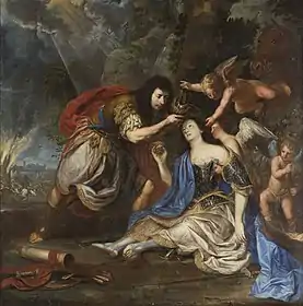 Jan de Herdt's brother had preceded him as he was working in Vienna as a goldsmith to the court and may have been instrumental in introducing Jan to the court in Vienna. While he is believed to have arrived in Vienna around 1660, Jan is first documented in Vienna on 8 January 1662. On that date he signed his name in the ecclesiastical registers of the Schottenkirche (Scottish church) in Vienna as he together with the Flemish engraver Franciscus van der Steen acted as a witnesses at the wedding of the Dutch artist Hans de Jode. Jan de Herdt later collaborated with van der Steen on a series of aristocratic portraits for the publication Historia di Lepoldo Cesare.[2] Frans Geffels also contributed to this publication.[11] In Vienna, de Herdt painted portraits of courtiers as well as history paintings for their chateaux and palaces.[8] He appears in the business records of Forchondt, a family business of art dealers from Antwerp who served clients throughout Europe and had a branch in Vienna. The son of the founder of the family business trained as a goldsmith with Jan's brother in Vienna. The records of the Forchondt firm show that in 1671 Prince Schwarzenberg bought a painting on the subject of Armida and Rinaldo, which was likely the Rinaldo preventing Armida's suicide by de Herdt (now in the former Augustinian monastery in Brno).[2]